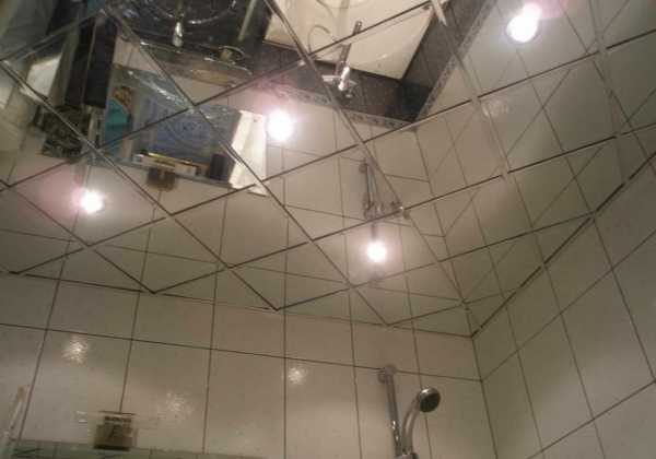 - Зеркальный, витражный, светящийся или классический белый потолок уместен именно в маленькой ванной.