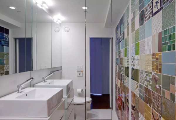Вместо того, чтобы весь санузел укладывать плиткой, сделайте акцентную стену (обычно она находится напротив двери). При этом, участок акцента может быть небольшим, но очень эффектным и уместным.