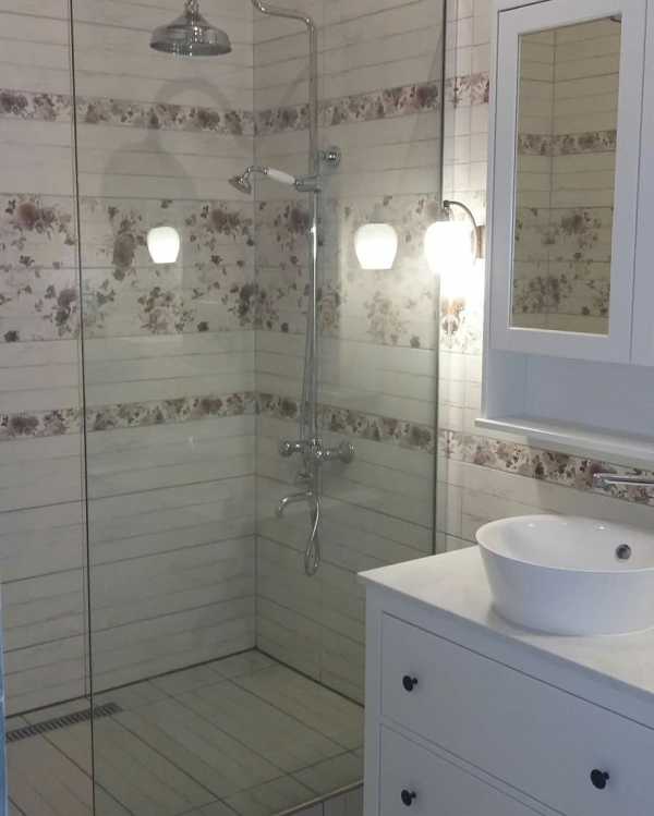 - однотонный кафель либо украшенный нежными цветочными узорами, разнообразными орнаментами, печворком, геометрическими фигурами, тонкими вензелями и прочим;