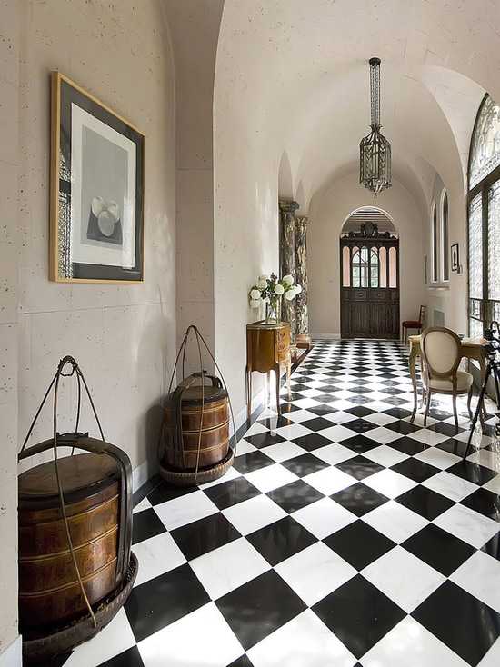 Шахматное сочетание на полу черной и белой плитки — универсальное решение, которое выгодно для любого стиля. Этот вариант прост в исполнении и расширяет пространство, выглядит элегантно. Данная плитка в коридоре в квартире будет смотреться интереснее, если в интерьере использовать черные деревянные полки, шкафы, стулья. Если проходы широкие, то можно установить мягкую мебель с полосатой черно-белой обивкой. Старайтесь придерживаться главного правила – чем меньше коридор, тем больше в комнате нужно использовать светлого материала и меньше черной плитки.