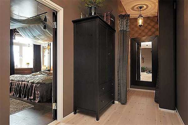 - Отделку выполняют за счет темных цветов, максимально утяжеляя интерьер комнаты. Таким образом, на фоне тесноты коридора следующая за ним комната будет казаться светлой и просторной. Этот прием работает с изначально маленьким пространством.