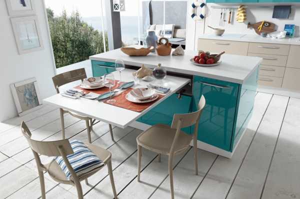 Владельцев кухонь нестандартного или малогабаритного формата привлекает возможность превращения мебельного фасада в полноценное обеденное пространство одним движением руки. Причем в остальное время место останется свободным.