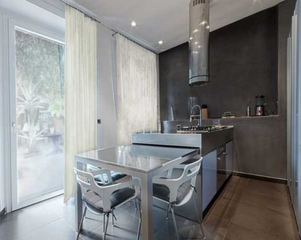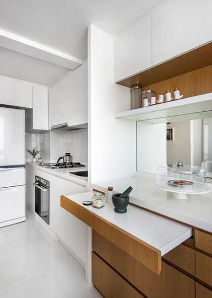 Выдвижной кухонный стол лаконично дополнит интерьер маленькой кухни.