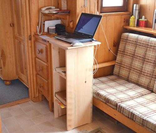 Как видите, тумба немного ниже, а потому помещается под столом. Также она неплохо смотрится и рядом со столом. Мало того, тумбу можно слегка повернуть по диагонали. Причём, всё это реально сделать в одиночку, благодаря мебельным колёсным опорам, которые на неё установлены.