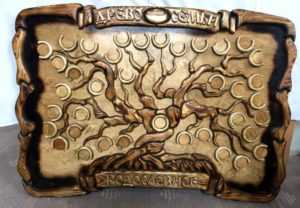Оригинальный сувенир можно изготовить в виде панно на стену. Созданное дерево будет символизировать крепкие семейные узы. Кроме того, на каждом спиле, если позволяет размер, несложно написать пожелание или имена гостей.