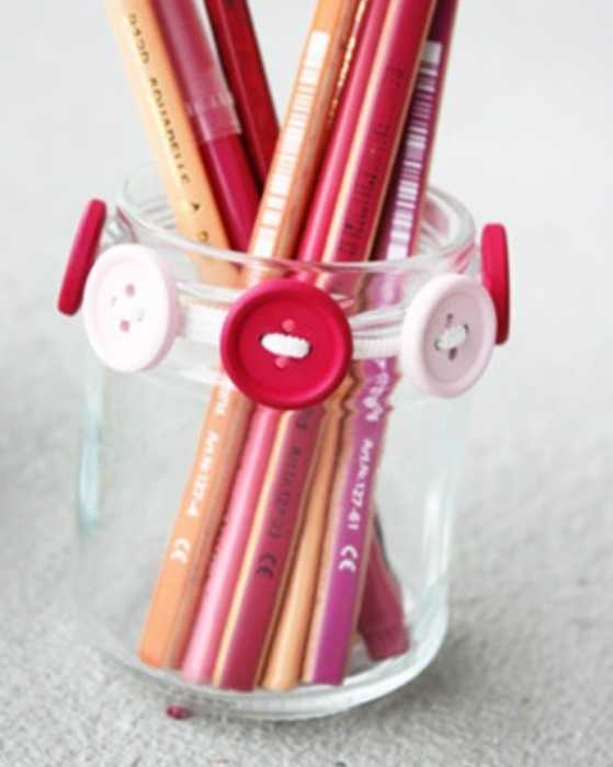 Стеклянная банка может стать эксклюзивной подставкой для карандашей, если ее украсить пуговицами.