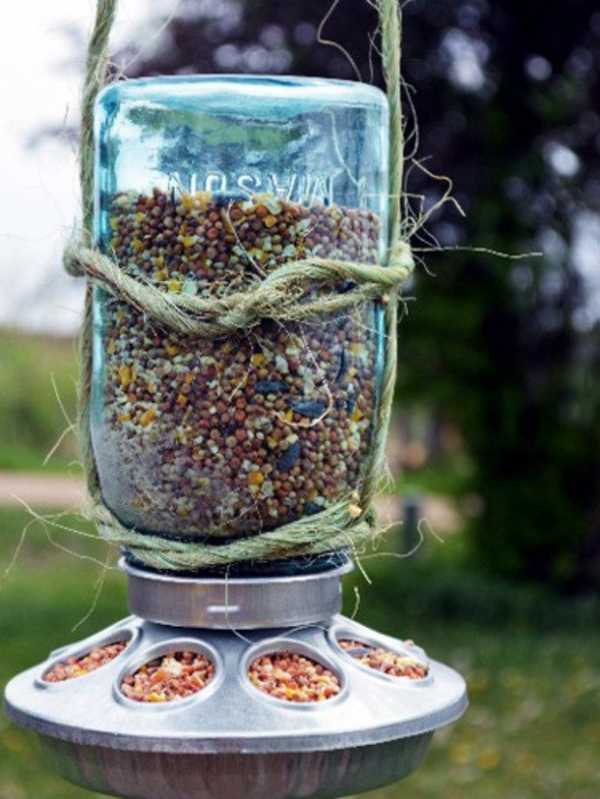 Необычная кормушка для птиц из обыкновенной стеклянной банки.