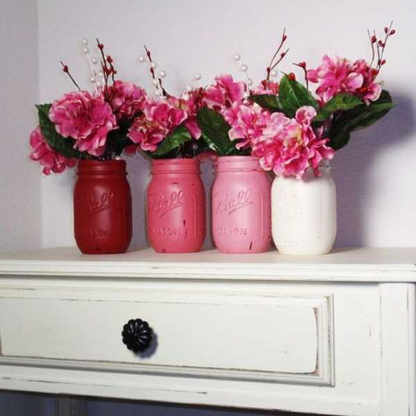 14. Вазы: залейте дно чистой сухой банки акриловой краской (примерно 5 см), переверните банку и медленно поворачивайте ее (краска должна равномерно растечься по всей внутренней стороне банки). Внимание! Наливать воду в такие банки нельзя, это чисто декоративный элемент.