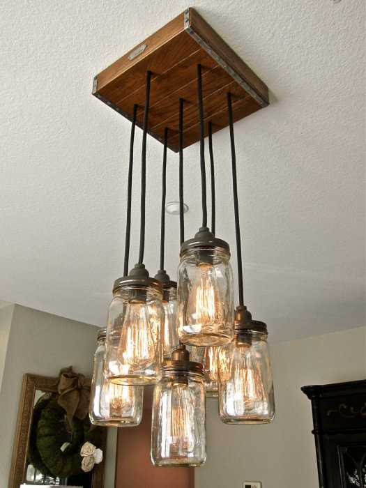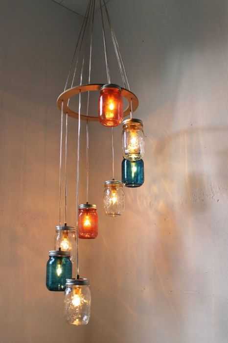 Красивая люстра из стеклянных банок, которая позволит дополнительно осветить помещение и сделать его более комфортным.