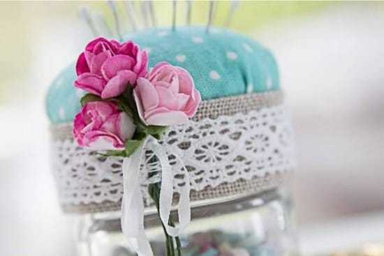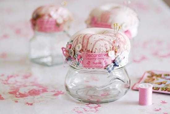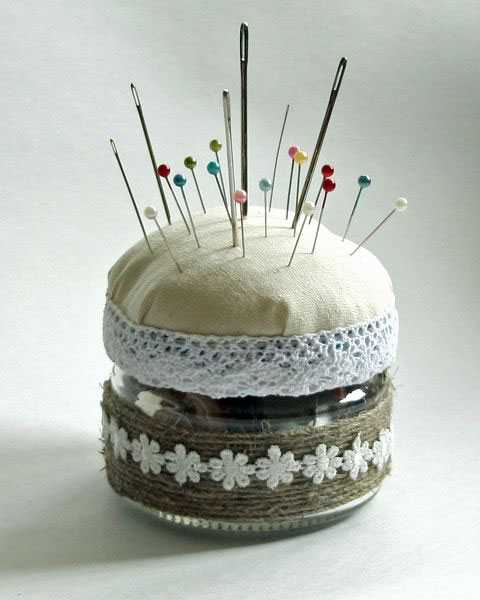 - Игольницы. Из стеклянных баночек легко смастерить вот такие милые игольницы, в которые поместится пуговицы и другие маленькие рукодельные штучки.