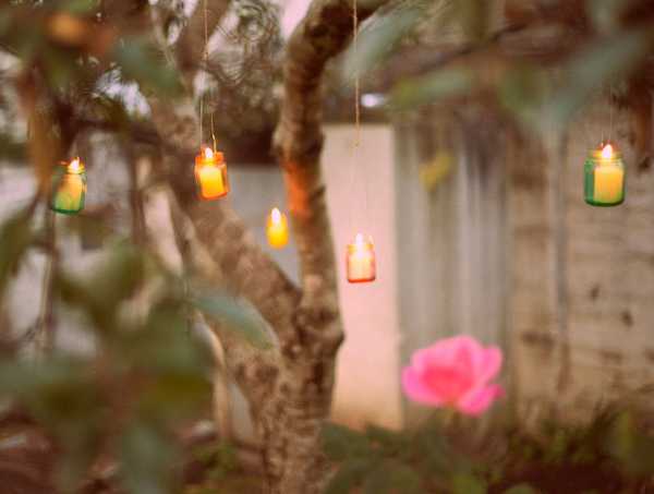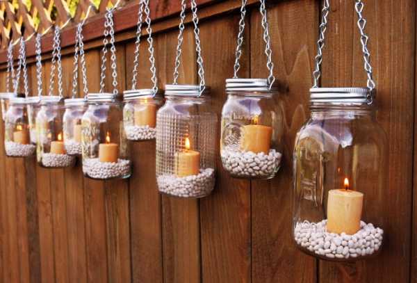 - Подсвечники для сада. Купите множество маленьких свечек, каждую положите в свою баночку и подвести их за веревки на ветвях деревьев. Красивый антураж для романтического вечера готов.