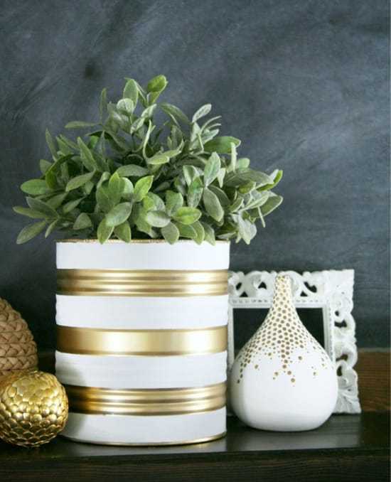 Использовав скотч как трафарет, вы сможете нарисовать на жестянке ровные полоски, зигзаги, ромбы и другие геометрические фигуры. Например, горшки на фото ниже сначала покрасили золотой аэрозольной краской, дождались ее полного высыхания, а затем с помощью малярного скотча и нарисовали цветные полоски акриловыми красками.