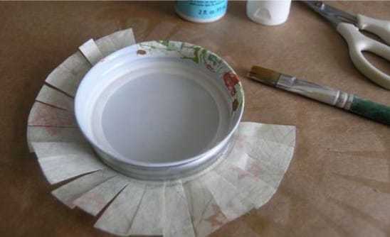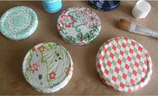 Крышки можно декорировать в технике декупаж, обклеить их тканью, оберточной бумагой, покрасить грифельной, магнитной или цветной акриловой краской.