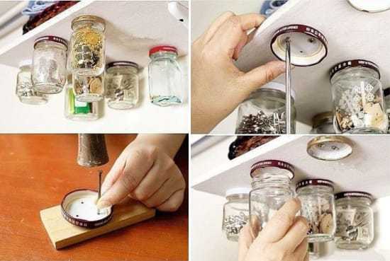 - Хранение для мелочей. Из банок получаются не только красивые вещи, но и весьма практичные. Прикрутите крышки к деревянной поверхности вы получите очень удобные емкости для хранения мелочей.