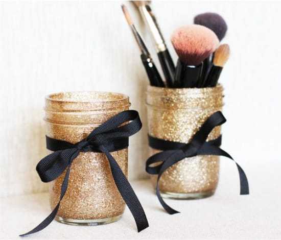 Конечно, украшать можно не только крышки, но и сами стеклянные банки. К примеру, вот такие блестящие стаканчики для хранения косметических кистей покрыты блестками изнутри (приклеены на прозрачный клей ПВА).
