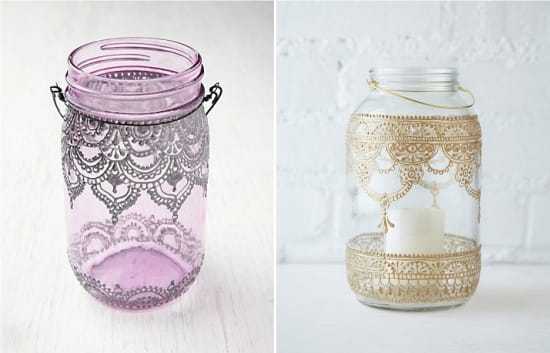 Декор стеклянных банок росписью в точечной или витражной технике превратит самую простую склянку в изящную вазу или подсвечник. На фото ниже самодельные подсвечники расписаны контурными красками.