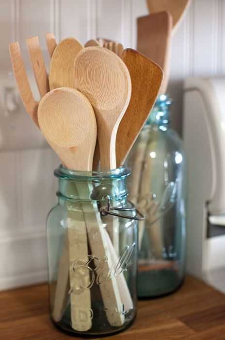 Стеклянные банки, которые можно использовать для хранения кухонных принадлежностей.