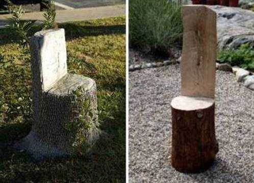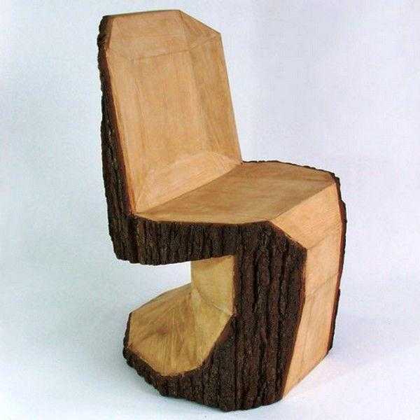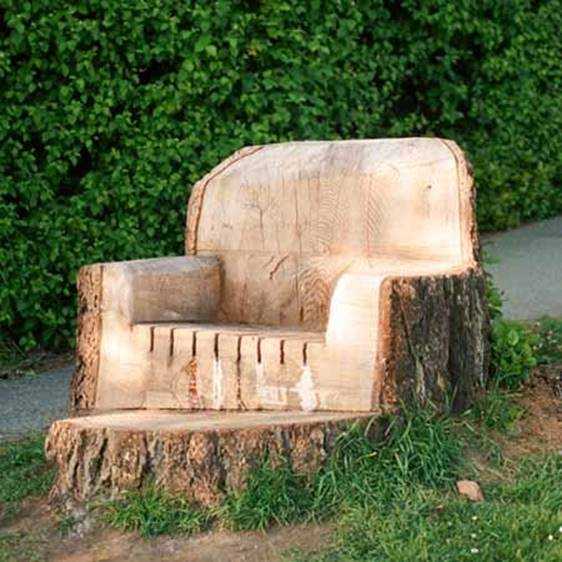 Из большого бревна для дачного участка можно вырезать с помощью бензопилы такой удобный стул. Чтобы он был устойчивым, надо сначала ровно спилить основание и установить его на место расположения. Дальше начинайте обработку сиденья. Здесь нужно действовать осторожно, чтобы не сделать его слишком тонким, иначе при упоре тела на него тонкий слой может обломиться и доставить неприятности сидящему человеку.