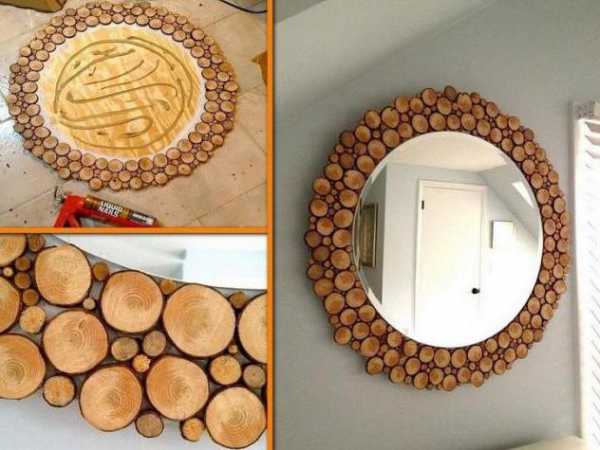 Из небольших спиленных из дерева кругов можно красиво оформить рамку для зеркала или картины. Нужно нарезать много одинаковых по толщине деталей. Для заполнения пространства между крупными элементами заготавливаются и мелкие кружочки из веток. Работа мелкая и щепетильная, ведь каждую деталь нужно обработать. Сначала срезается кора, затем каждый элемент несколько раз обрабатывается наждачкой. Дальше нужно будет покрыть ее лаком. Когда все элементы готовы, то берется крепкая основа, которая хорошо будет держать форму. Лучше взять лист фанеры.