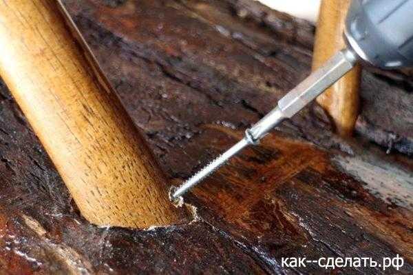 Отверстие делается при помощи дрели, затем неровности шлифуются, а старые отметки затираются ластиком, а поверхность покрывается лаком.