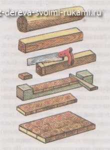 Прекрасным декоративным материалом для изготовления деревянных подставок, шкатулок, заколок и т.д. является клееная торцовая плита. Чтобы ее изготовить, потребуются веточки диаметром от 3 см. Их предварительно строгают до прямоугольных брусков, а затем распиливают на тонкие пластинки толщиной от 5 до 8 мм. Лучше всего их распиливать циркулярной торцовой пилой, но можно и вручную ножовкой. Для склеивания пластин можно сделать простое приспособление из толстой доски.