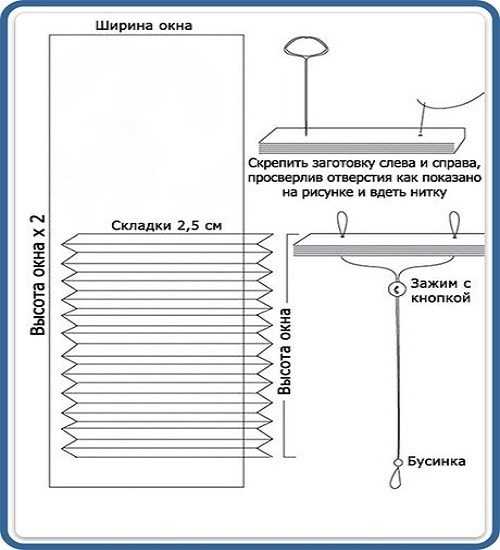 С помощью шила или отвертки в средней части сложенного полотна проделываем отверстие, в которое вставляем шнур. Расправляем жалюзи, фиксируем шнур в верхней части узелком.