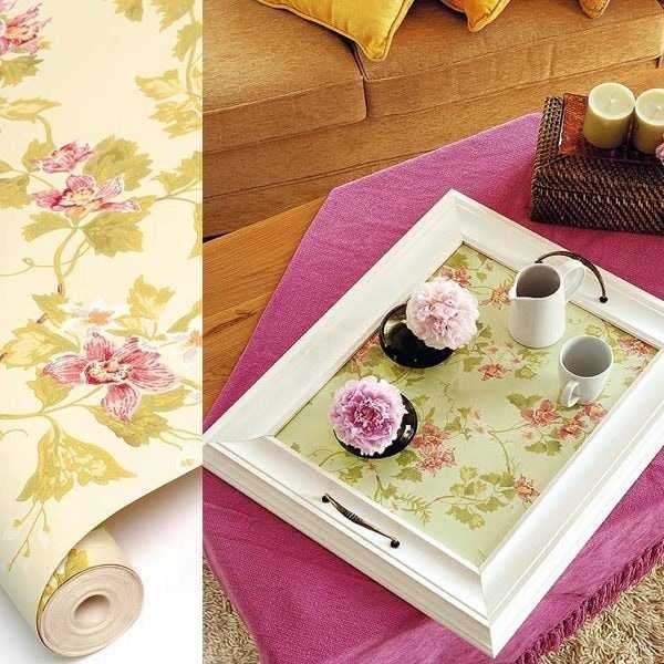 Интересным считается применение неиспользованных кусков обоев для декорирования мебели или ее частей. Так, до сих пор в интерьерах в стиле прованс или кантри популярно декорирование посудного шкафа или других шкафов с открытыми полками обоями внутри. Такой декор из остатков обоев даже имеет определенное просторечное название – «бабушкин дизайн».