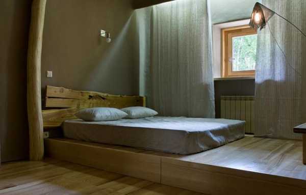 Уютный интерьер с подиумом из нарочито грубо обработанного дерева
