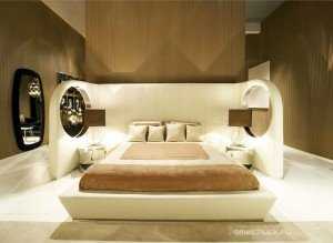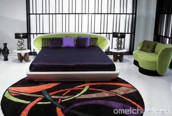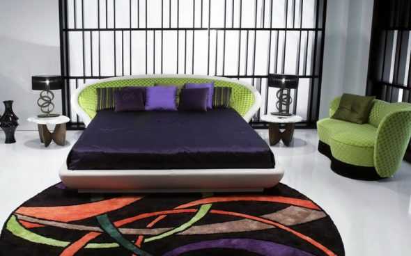 Кровать-подиум с мягкой изогнутой спинкой в интерьере спальни