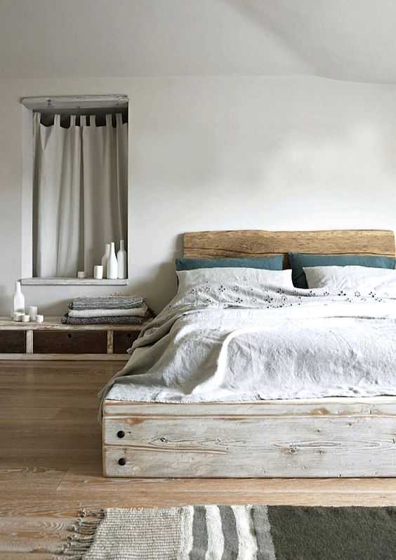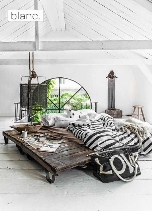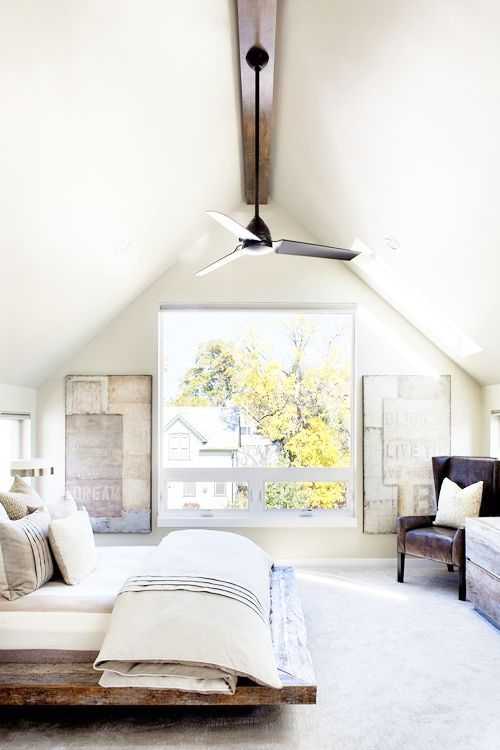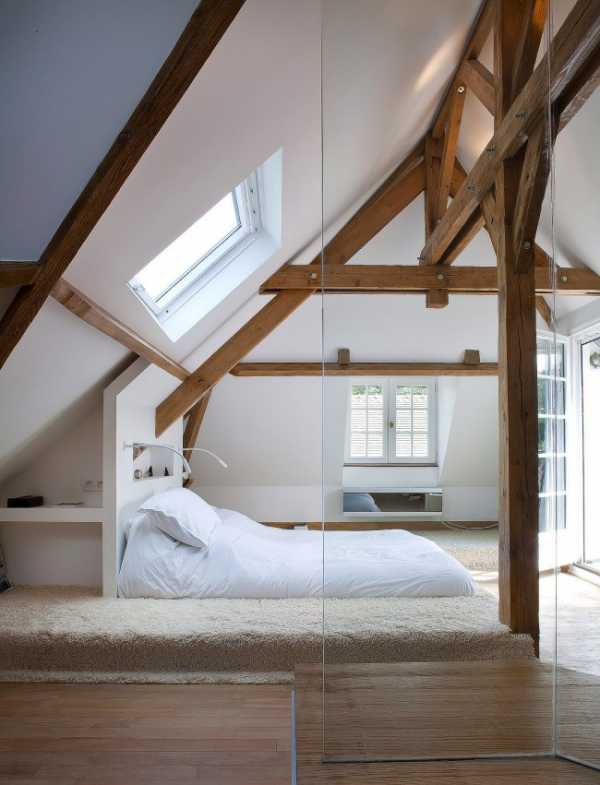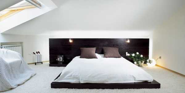 Минималистичная кровать-подиум в уютной атмосферы мансарды