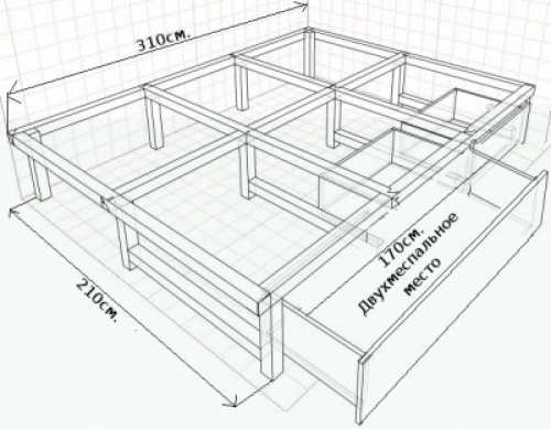 Чертеж подиума с выдвижной кроватью и ящиками для хранения