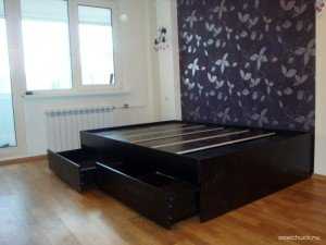 Кровать-подиум своими рукамиТем, кто хочет получить более функциональное решение придется постараться. Например, выдвижные ящики и фурнитуру можно купить в готовом виде. Для качественного распила и резки листов ДСП требуется дорогое оборудование, поэтому самый простой способ это выполнить чертеж и раскрой листа в специальной программе и заказать распил у профессионалов. Сборку же осуществить самостоятельно.