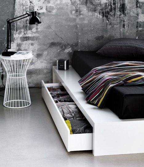 Идея: обустройство системы хранения под кроватью таким образом, чтобы матрац оказался намного ниже бортиков