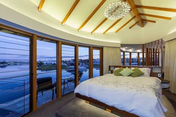 Шикарная спальня с кроватью-подиум, с которой открывается вид на залив