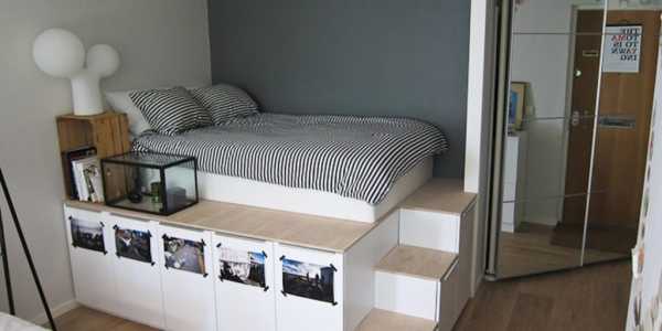 Кровать-подиум в квартиреНачнем с того, что кровать с подиумом подразумевает увеличенное использование пространства, которое складывается из самого подиума и дополнительно кровати или матраца. В таком виде, если установить всю эту конструкцию в однокомнатной квартире, доступное для передвижения пространство уменьшится в двое. Возможно, как дизайнерское решение — это выглядит и привлекательно, но тот, кто говорит об экономии пространства явно не жил в малометражной квартире.