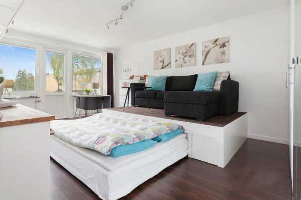 Высокий подиум с выдвижными ящиками, представляющими собой целую систему хранения — идеальный вариант для однокомнатной квартиры