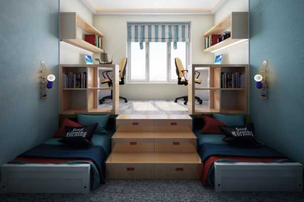 На подиуме свободно размещаются учебные уголки и ящики для хранения вещей, а ступени, которые ведут на подиум, одновременно являются выдвижными ящиками. Пожалуй, этот и подобные ему варианты являются наиболее практичными и эргономичными примерами использования кроватей-подиумов в интерьере.