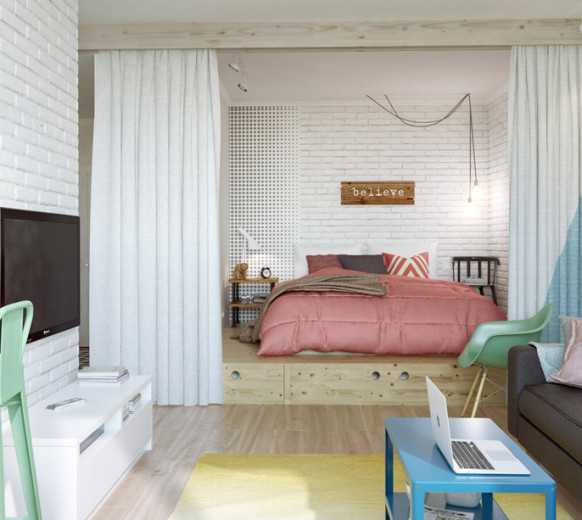 Подиум визуально и практически отделяет место для сна, что особенно актуально для однокомнатных квартир и студий.