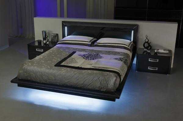 Чтобы визуально сделать низкую конструкцию более воздушной и легкой, можно дополнить ее нижнюю часть подсветкой. В ночное время суток такая мебель с подсветкой выглядит так, словно парит в воздухе. Но стоит помнить, что этот вариант не подойдет пожилым людям и людям, которые имеют проблемы с суставами.