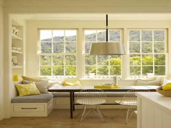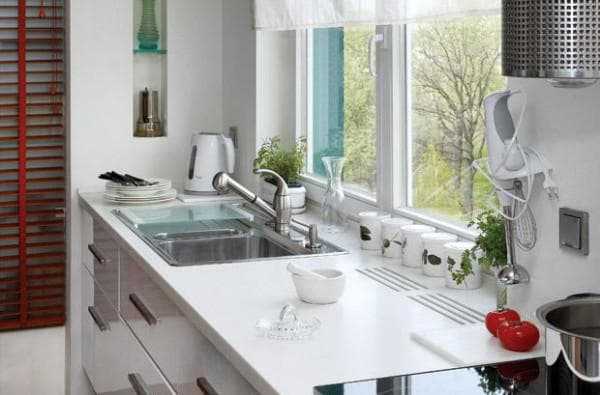 Основной плюс такого варианта—это то, что в этом случае кухня не будет казаться замкнутым пространством. Появляется больше возможностей для дизайнерских решений: подоконник, плавно переходящий в столешницу, идеально вписывается в интерьеры многих стилей, от классических до ультрасовременных. Да и хозяйка получает возможность при готовке не упираться взглядом в стену, а смотреть на пейзаж за окном. Такое расположение рабочей поверхности дает возможность не включать электрическое освещение в дневное время.