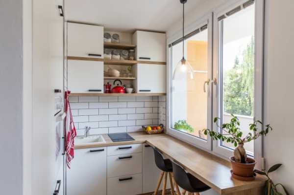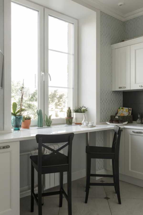 Столешница-подоконник интересный вариант встроить и экономить место, для многих стилей в интерьере: это и минимализм, и скандинавский стиль, и стиль шале. Превосходно смотрится такая столешница на маленькой белой кухне в хрущевке, где мало квадратов.