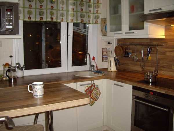 Устанавливая столешницу у окна, освобождается площадь для мойки и место для приготовления еды. За счет естественного освещения экономится электрическая энергия, а под столом появляется возможность разместить тумбы для хранения кухонных предметов.
