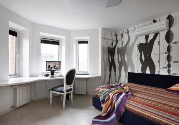 На фото детская комната с белым столом-подоконником, расположенном в эркере.