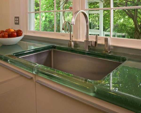 - стекло: закаленное противоударное стекло может стать прекрасной поверхностью для столешницы, но в этом случае надо определиться, что будет её основой, стекло — прозрачный материал;