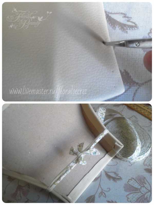 И в завершении работы нужно закрепить сгибы при помощи ленточки или веревочки так, чтобы угол между сгибом и основной частью бюстика составлял 90 градусов. Это придаст большей устойчивости нашему дисплею. Делаем отверстия при помощи ножниц на краях наших сгибов, отступив см 4-5 снизу, пропускаем ленточку и завязываем бантик.