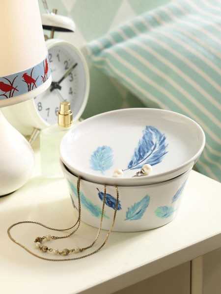 За основу взята простая однотонная фарфоровая баночка или чашечка, которую можно купить в ближайшем супермаркете. Очистите поверхность от пыли и грязи, а затем тонкой кистью нанесите рисунок — например, в виде перьев. Стильная штучка готова!