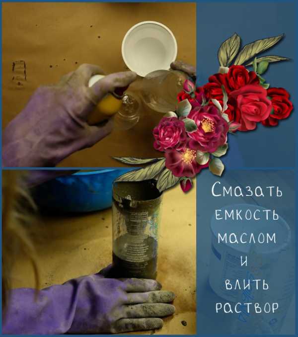 Далее нужно быстренько обрезать верхнюю часть подготовленной пластиковой емкости, допустим бутылки из-под шампуня для волос. Обычная бутылка не подойдет, она сморщится от воздействия высоких температур расплавленного воска. Эту емкость изнутри следует тщательно промазать растительным маслом, данный шаг предотвратит прилипание цемента и воска к стенкам бутылки. Сюда вливаем подготовленный цементный раствор.