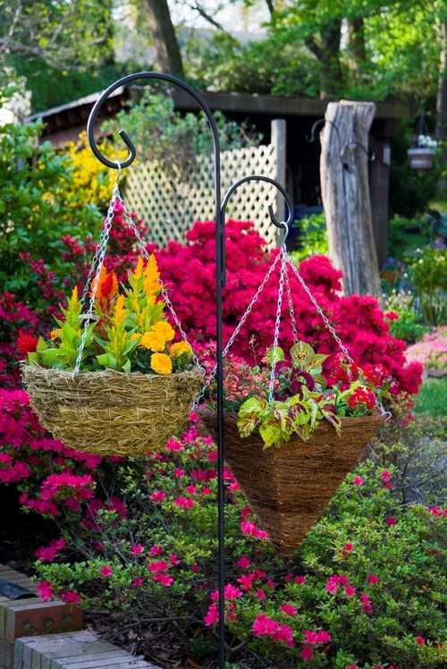 Однако при оформлении подвесных уличных клумб также важно учитывать особенности стиля приусадебного участка. Можно красиво подчеркнуть красоту ландшафта с помощью ярких цветовых решений или необычных форм, а можно сделать акцент на природной красоте растений.