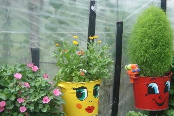 Если у Вас на даче завалялись старые лейки или вёдра с тазиками, не выбрасывайте, обработайте поверхность шкуркой от ржавчины, и раскрасьте их в яркие цвета. Внутрь модно поставить горшки (или пакеты с грунтом) и цветами. И эти предметы превратятся в забавные кашпо