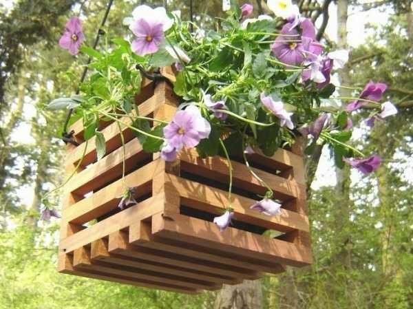 Деревянное кашпо, похожее на подвесные качели, «удержит» на себе целую клумбу с анютиными глазками (виолами)